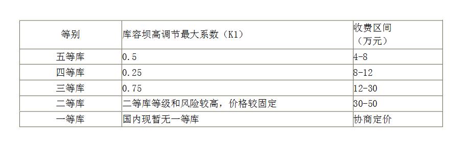 評(píng)價(jià)費(fèi)=對應(yīng)等別收費(fèi)區(qū)間費(fèi)用×[庫容壩高調(diào)節(jié)系數(shù)(K)+1];
