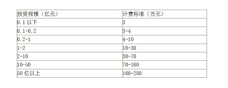 2.評(píng)價(jià)費(fèi)用根據(jù)項(xiàng)目投資額按計(jì)費(fèi)標(biāo)準(zhǔn)采用直線內(nèi)插法計(jì)算。